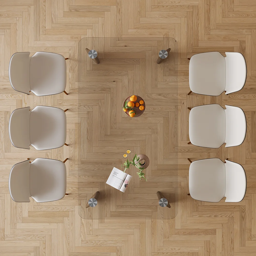Whether paired with bold dining chairs for a statement look or with subtle seating for a minimalist approach, the Rectangle Tempo Glass Dining Table elevates any dining area with timeless elegance and functionality.