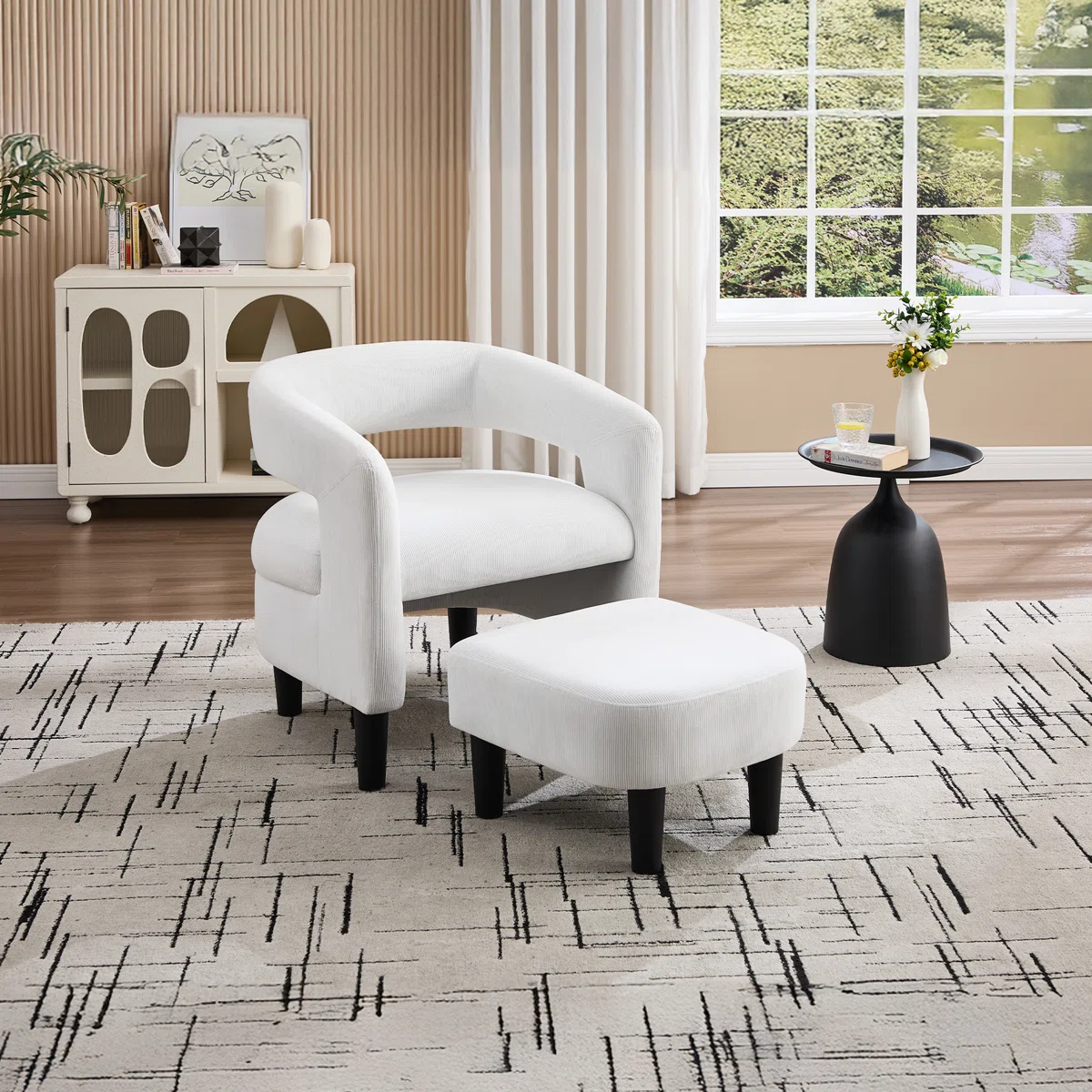 The push-in ottoman slides effortlessly under the seat when not in use, maintaining a clutter-free and organized look—ideal for compact spaces or minimalist interiors. Whether styled in a bedroom corner, office, or living area, this piece delivers both function and elegance.
