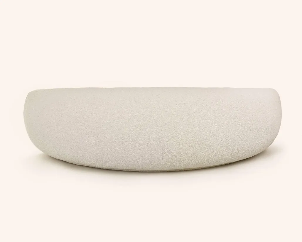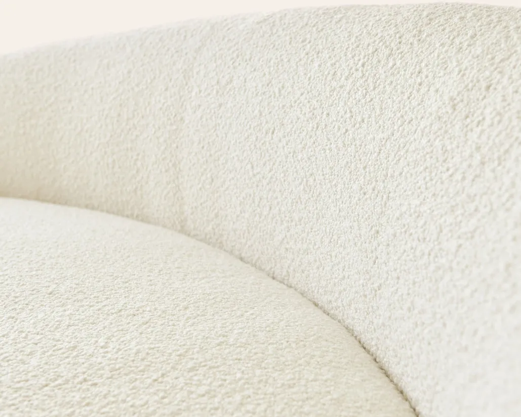 Crafted in an off-white shade, this sofa embodies understated luxury. Its sculptural silhouette makes it a perfect statement piece for contemporary apartments, luxury homes, and boutique spaces. The generous seating and soft boucle fabric invite you to sit back and relax, while its curved profile creates an inviting and stylish flow in your room.