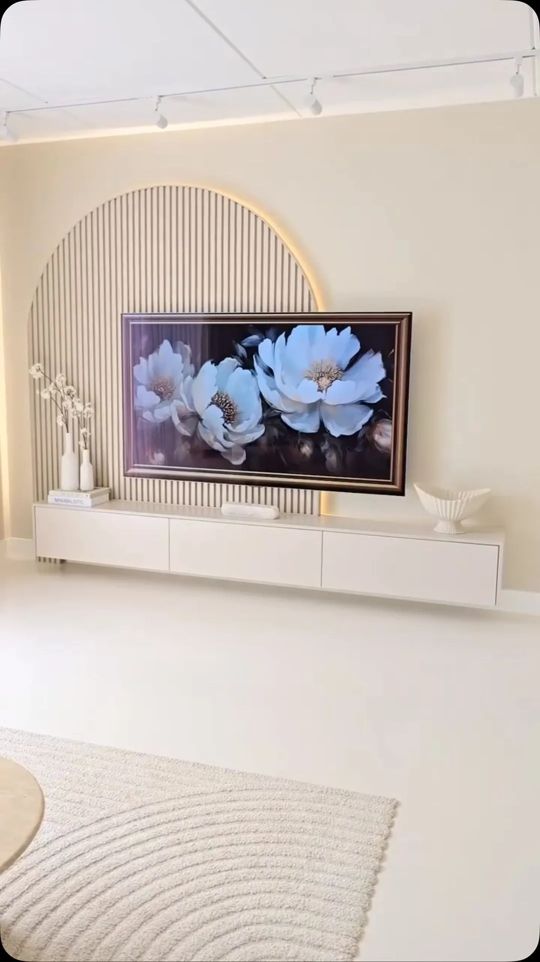 Crafted from premium materials, this unit merges form and function with effortless grace. The textured façade not only serves as a striking design element but also complements its sleek structure and clean lines. Behind its artistic exterior lies intelligent functionality, featuring concealed storage for entertainment devices and open shelving for décor, ensuring an organized and clutter-free setup.